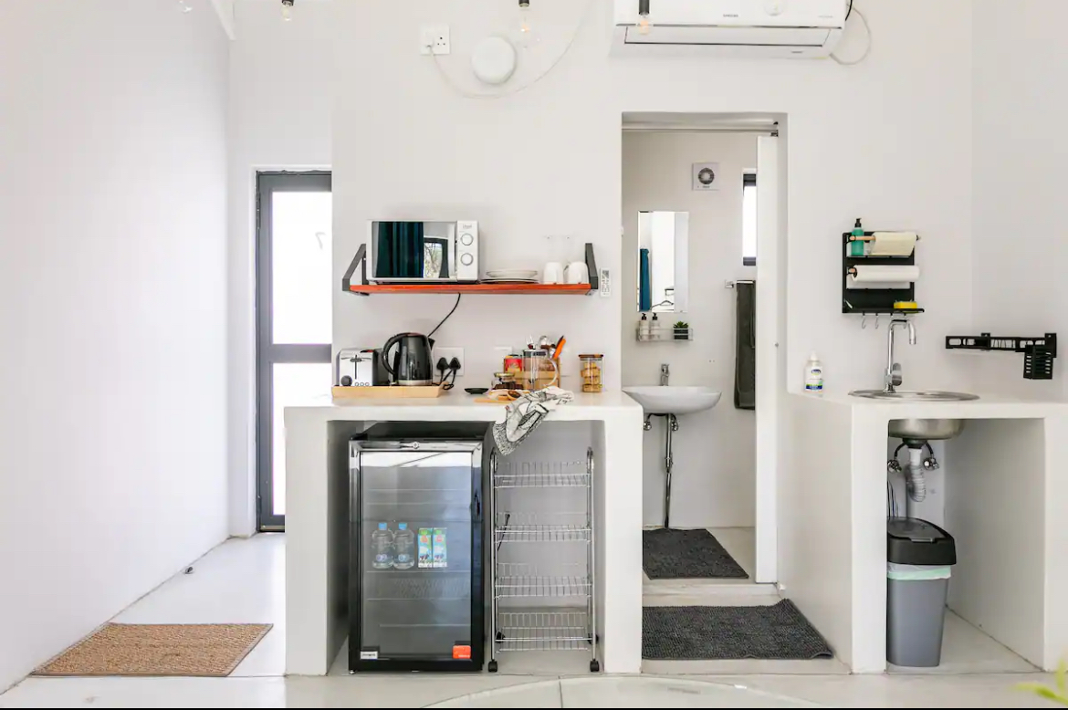 This is a spacious first floor unit with a large window looking out onto the tranquil garden frequented by many bird species. The room has exposed beams as a feature and is minimalist but with all the essentials that a business traveler needs.